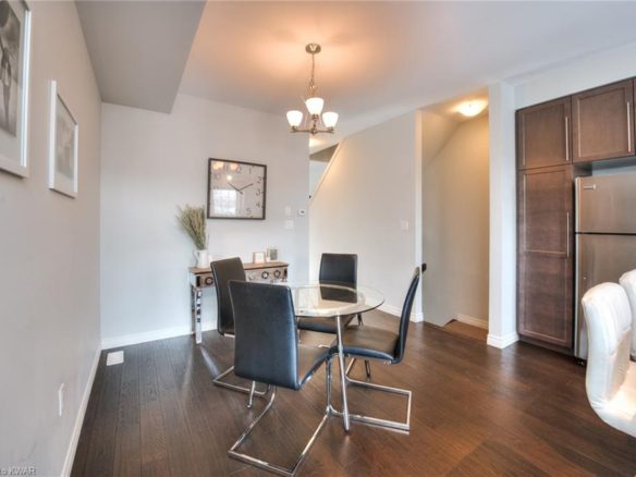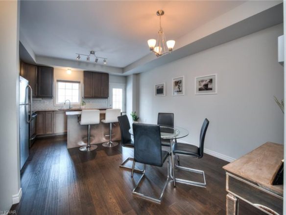 Contemporary urban appeal at Victoria Common – a two-bedroom, three-bathroom townhome, a Midtown location just a few minutes’ travel time from both Uptown Waterloo and Downtown Kitchener! The stylish modern layout maximizes living space across the two upper storeys and features high ceilings and a fashionable kitchen with granite countertops. The home flows with natural light and offers a tandom garage with a total of three parking spaces (2 in the garage, 1 out front). The bedrooms are each well proportioned, with the master suite boasting both an ensuite bath and walk-in closet. A rear-facing walkout from the kitchen leads to an elevated deck, with stairs down to a private partially fenced backyard – a rarity for this complex!