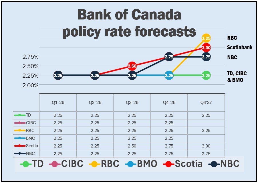 • TD Bank: Expects the policy rate to remain unchanged at 2.25% through the end of 2027.